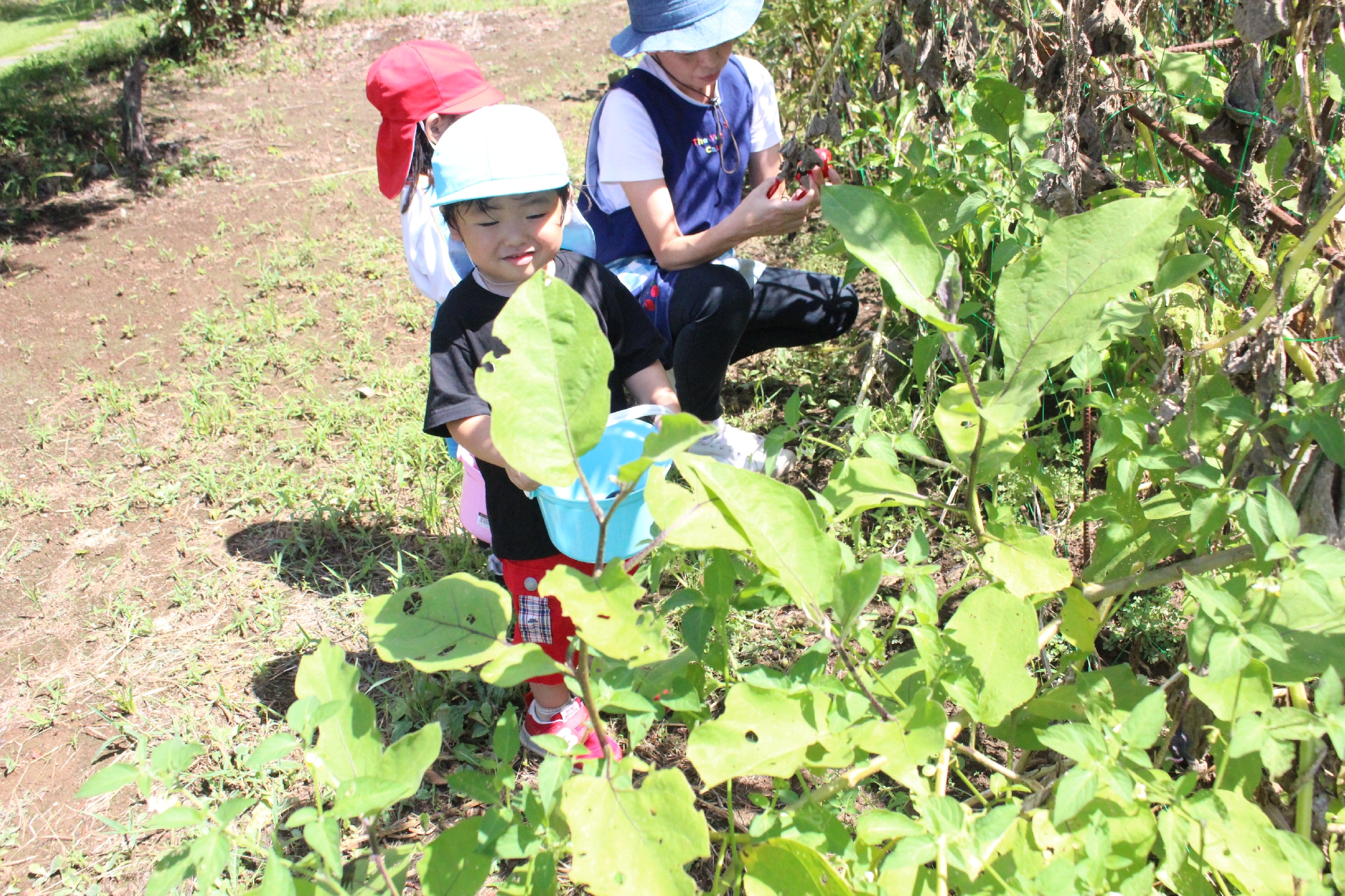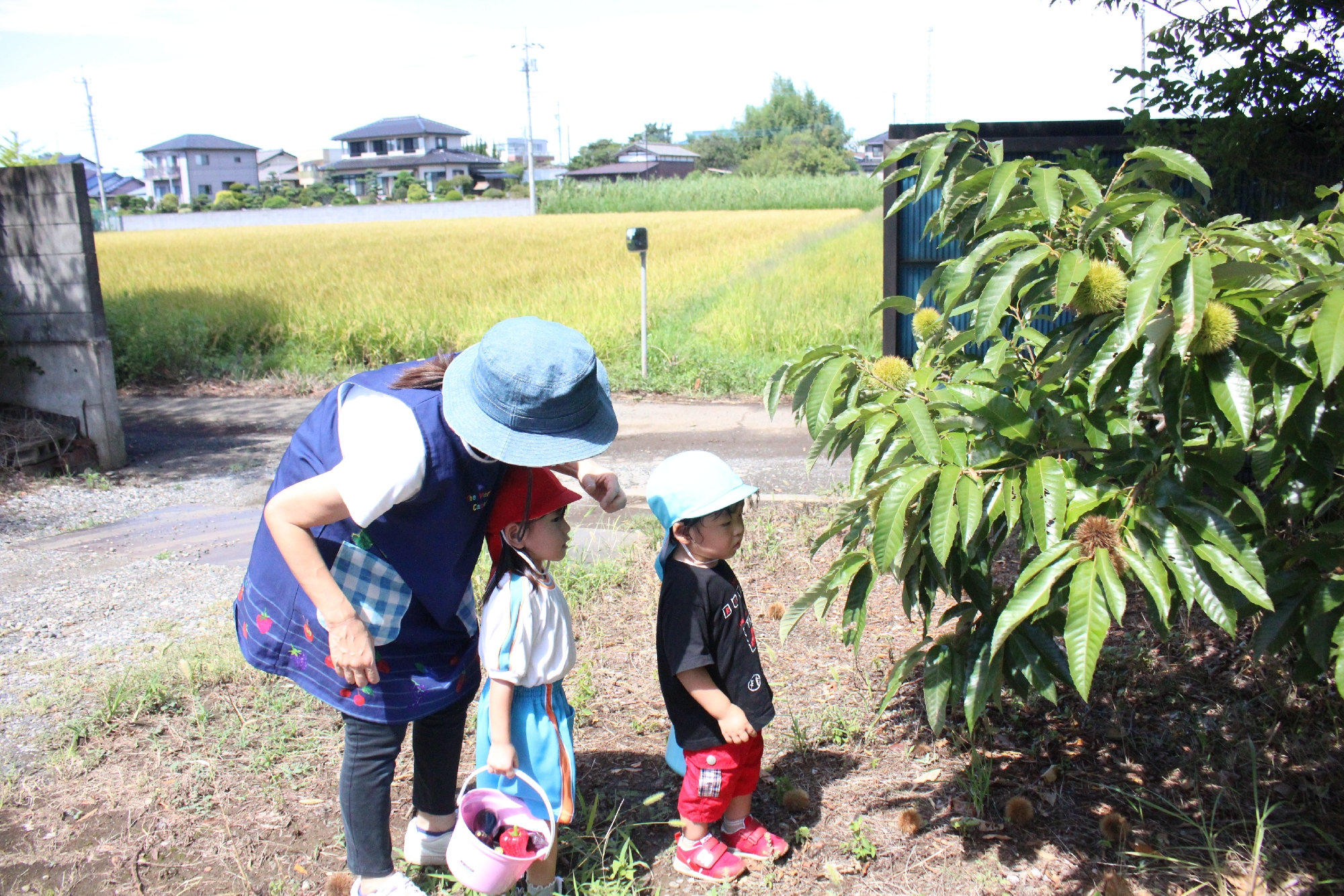持っていたバケツ一杯に野菜が入り「おもたいよー!」と言いながらも頑張って給食室まで運んでくれました。お寺東側の駐車場に実っている栗も見に行きました。