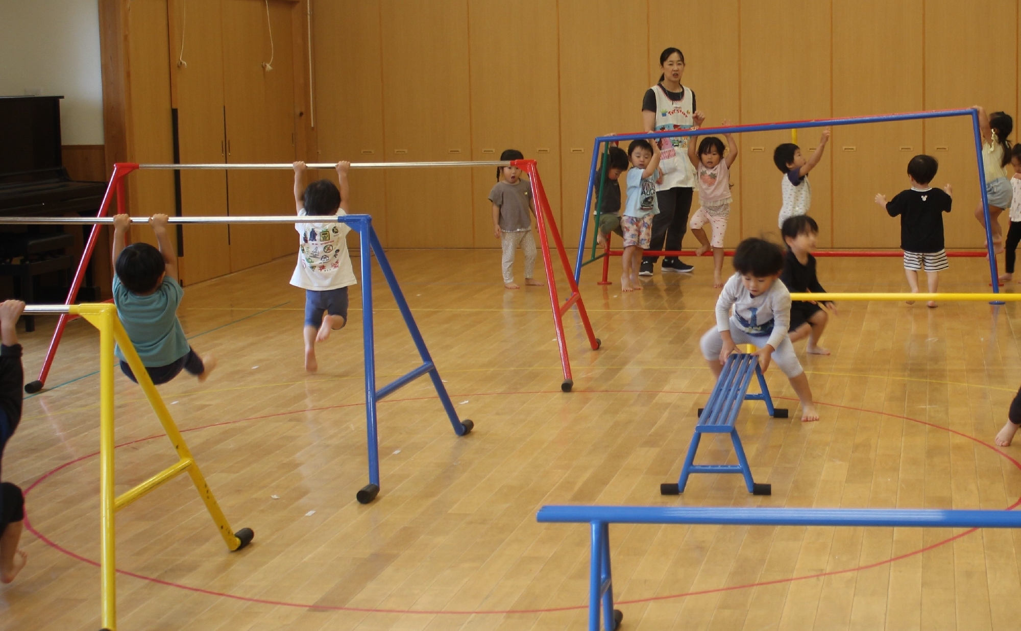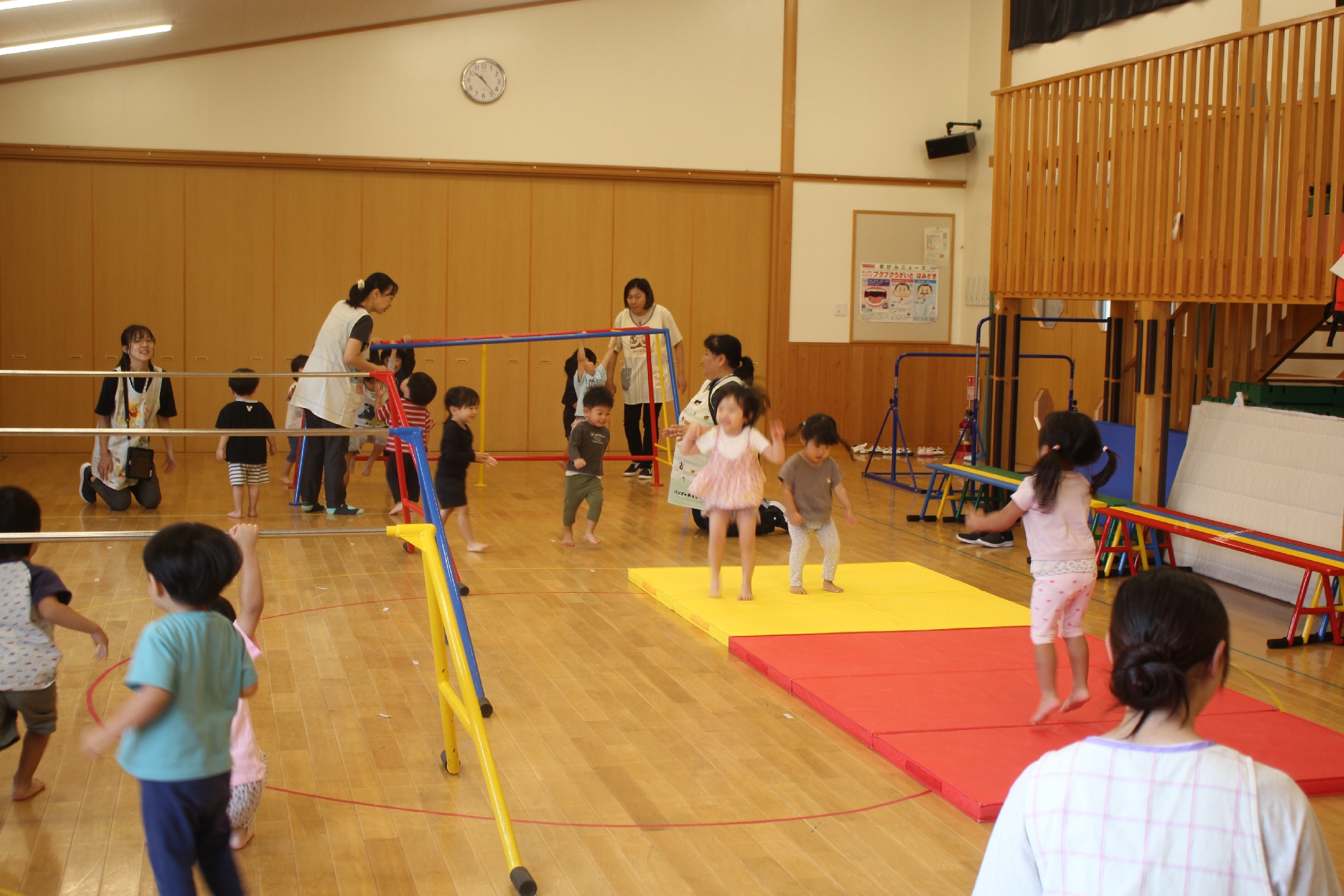 1.2才児さんは、初めてのサーキットでした!先生の声をよく聞いて、色々な動きを楽しむことができました。未満児さん用の小さい雲梯や鉄棒にぶら下がったり、マットの上でジャンプしたりとっても楽しそうでした。
