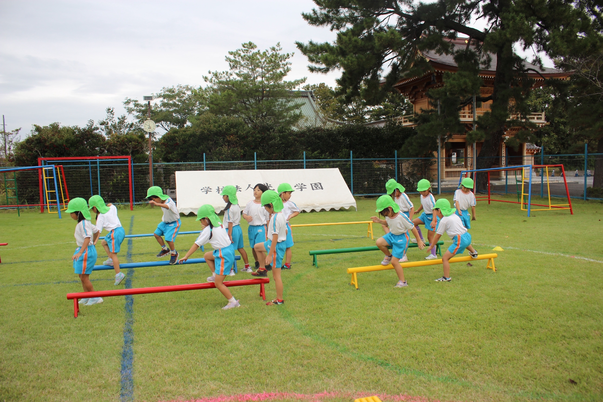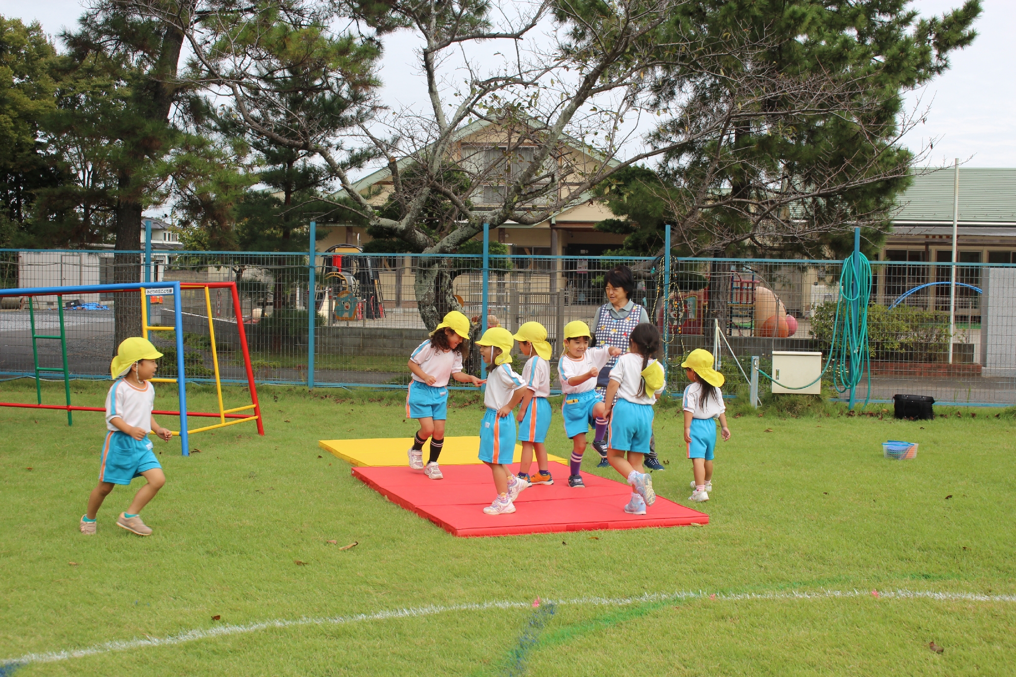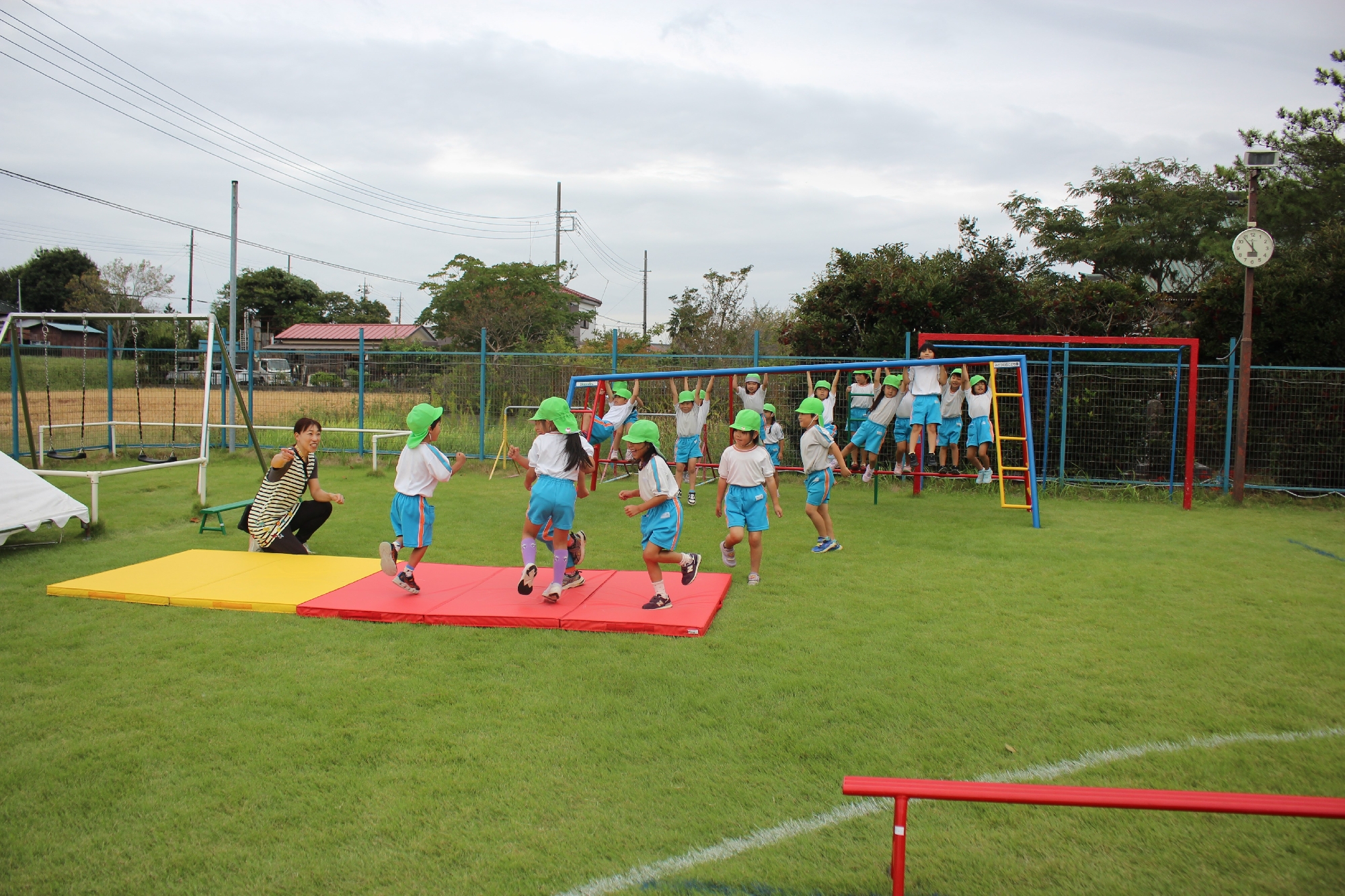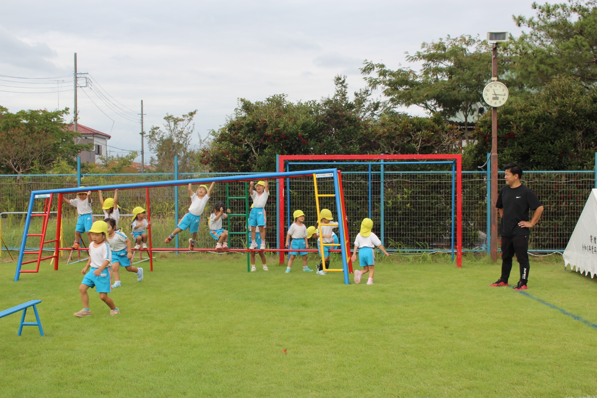 以上児さんも広場で走ったり、ぶら下がったりと楽しんで参加していました。遊具の使い方は様々な形があり、先生のお手本を見て真似をしたりと、新しいサーキット遊具を楽しんでいました♪