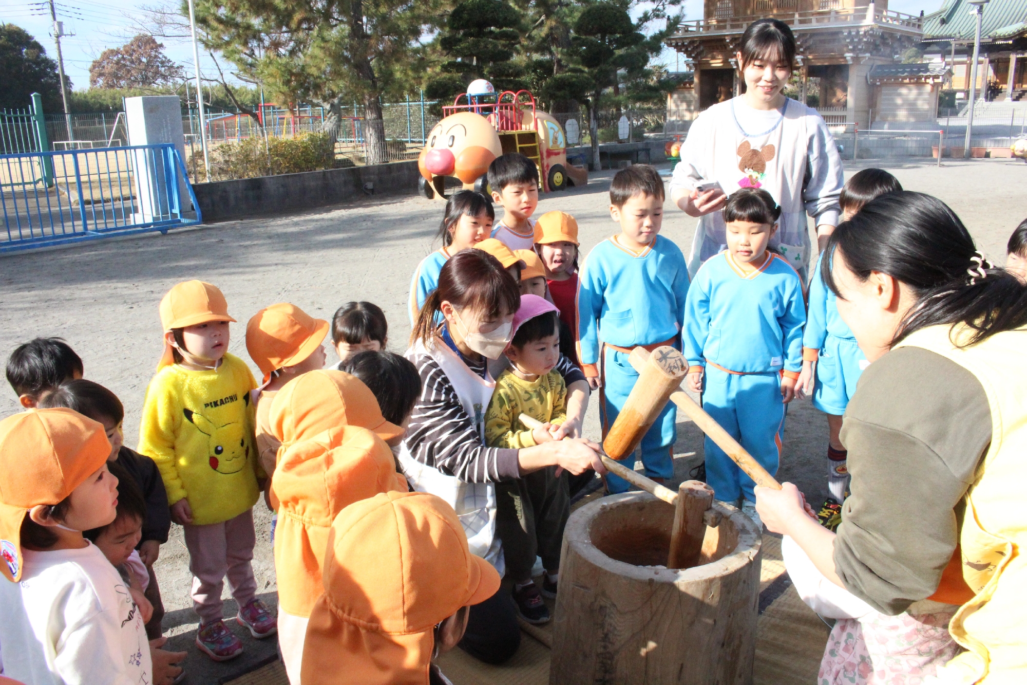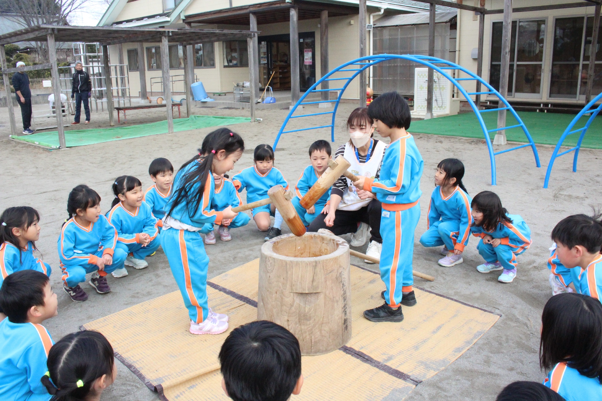 さすが年長組さん!自分達で杵を持ち順番に餅つき、「ぺったんこ!」の掛け声が元気一杯でした。