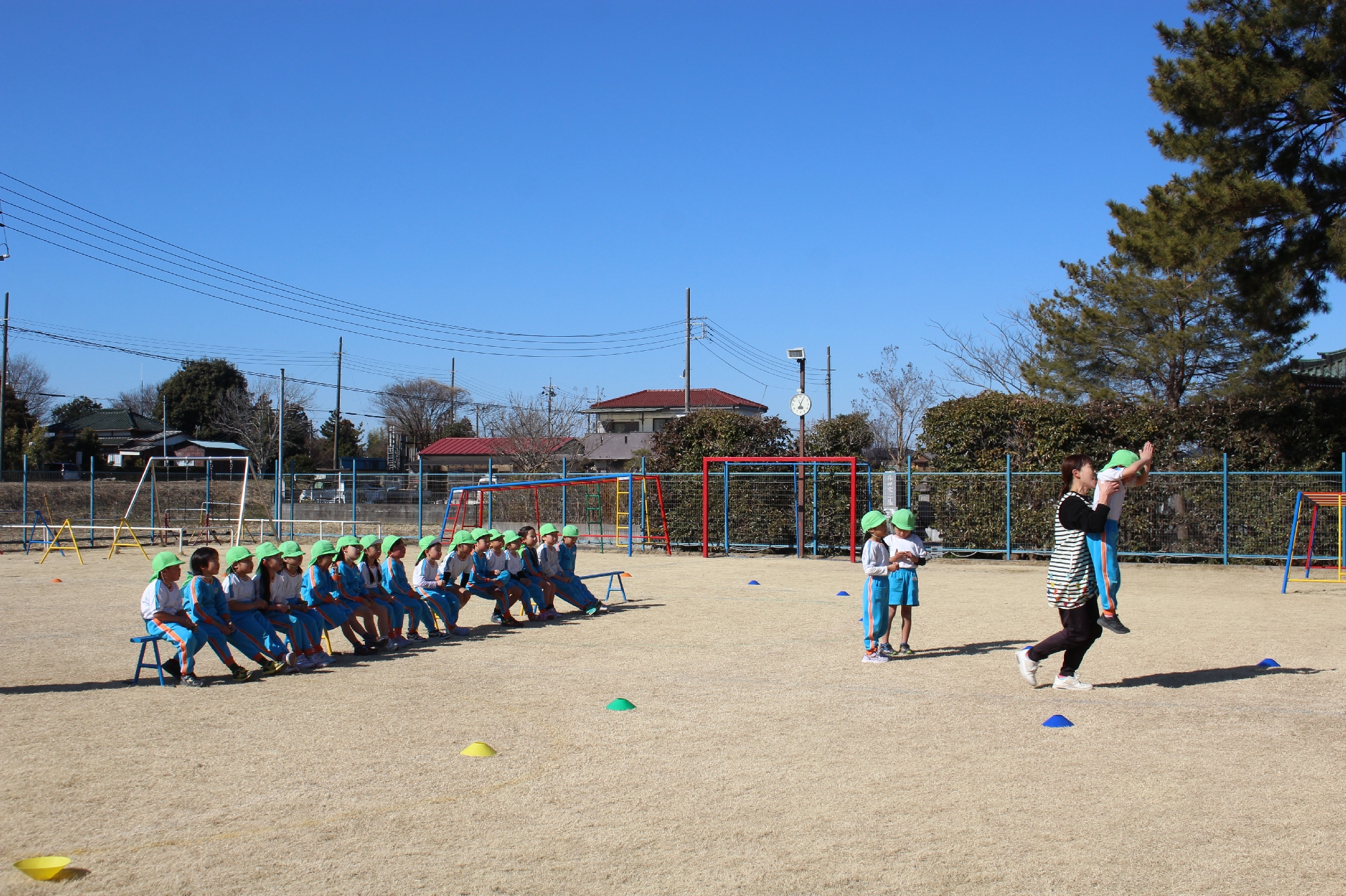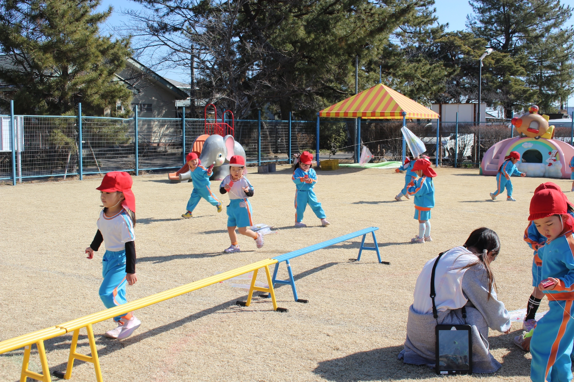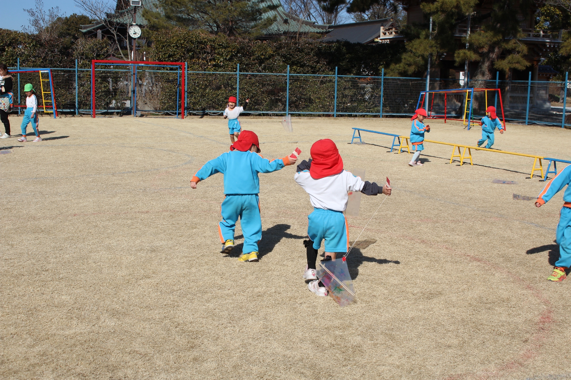 冬まつり2日目はたこあげも行いました!はじめはなかなか上手に飛ばすことが出来なかったお友だちもどんどんやっていくにつれ上手に凧を飛ばしていました。マラソン大会の後ではありましたが、とっても楽しそうに元気いっぱいい行っていましたよ!