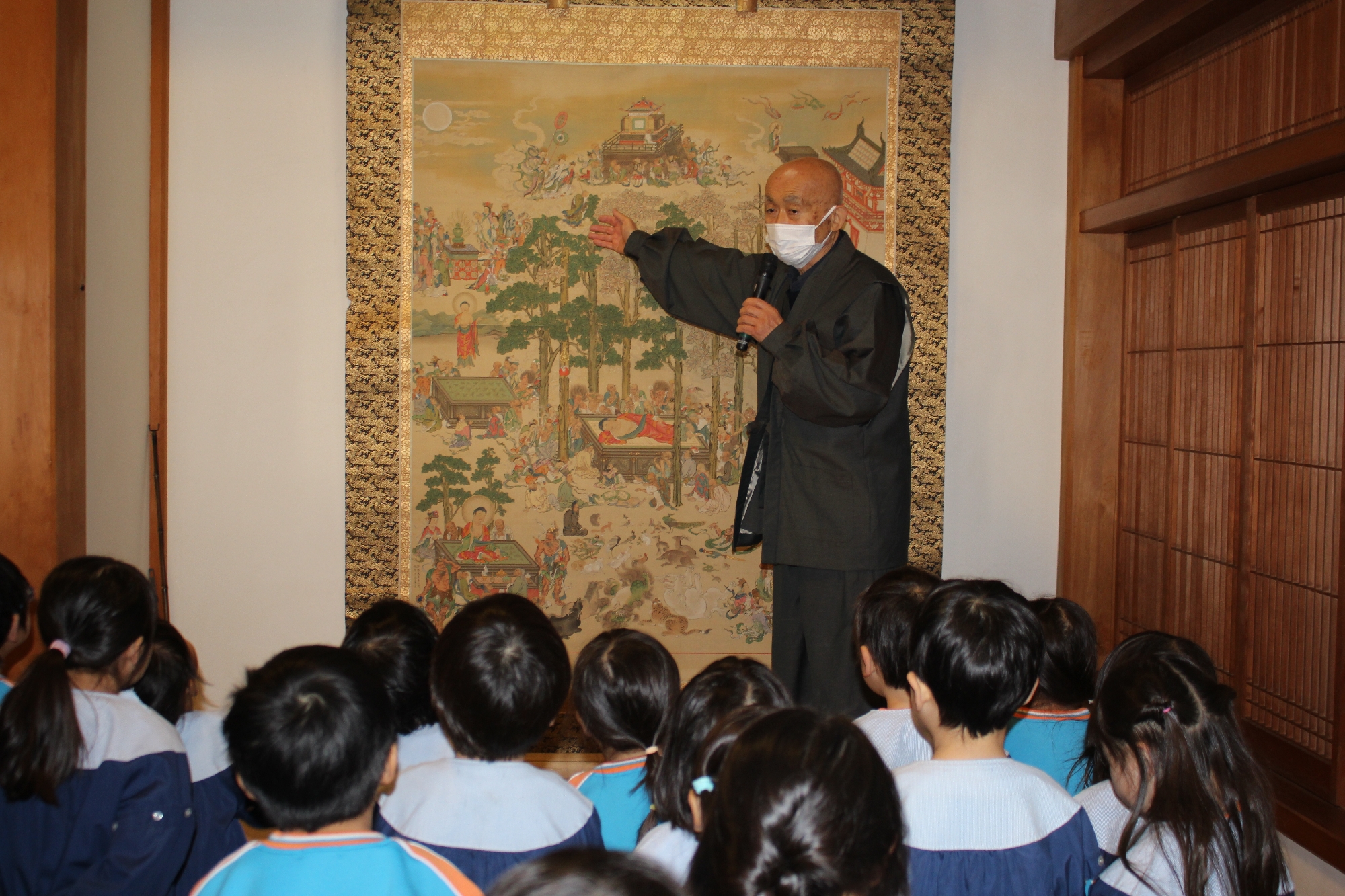 お釈迦様が亡くなった日のことや、お友だちに優しくすることの大切さについてお話を聞きました。